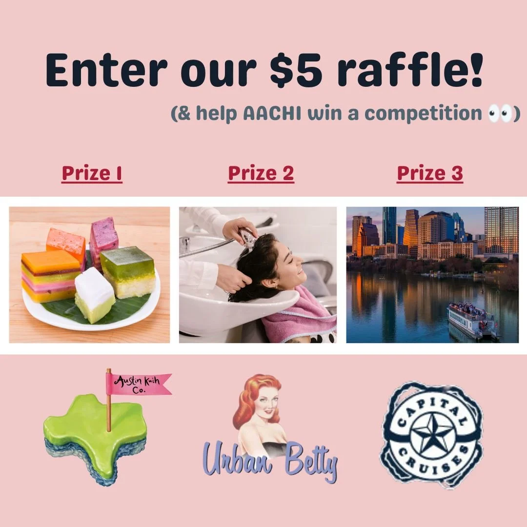 Donations to AACHI through May 31st earn raffle chances for prizes from Austin Kuih Co. Malaysian Kuih, Urban Betty Salon, and Capital Cruises in Austin, Texas.
